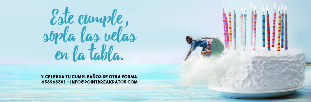 Cumpleaños Este año, haz algo diferente. Celebra tu cumpleaños con olas. Y sopla las velas sobre la tabla. GRUPOS REDUCIDOS PROFESORES TITULADOSCLASES DE INICIACIÓN O BAUTISMOCONVITE EN NUESTRO LOCALMATERIAL DE SURF INCLUIDO —— 20 € POR INVITADO ——